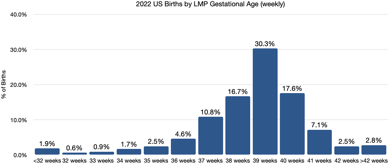 Now, here is the data from the National Center for Health Statistics visualized in a simple chart to help us answer the question of when babies are born by gestational age (*see footnote at the end for full data citation).